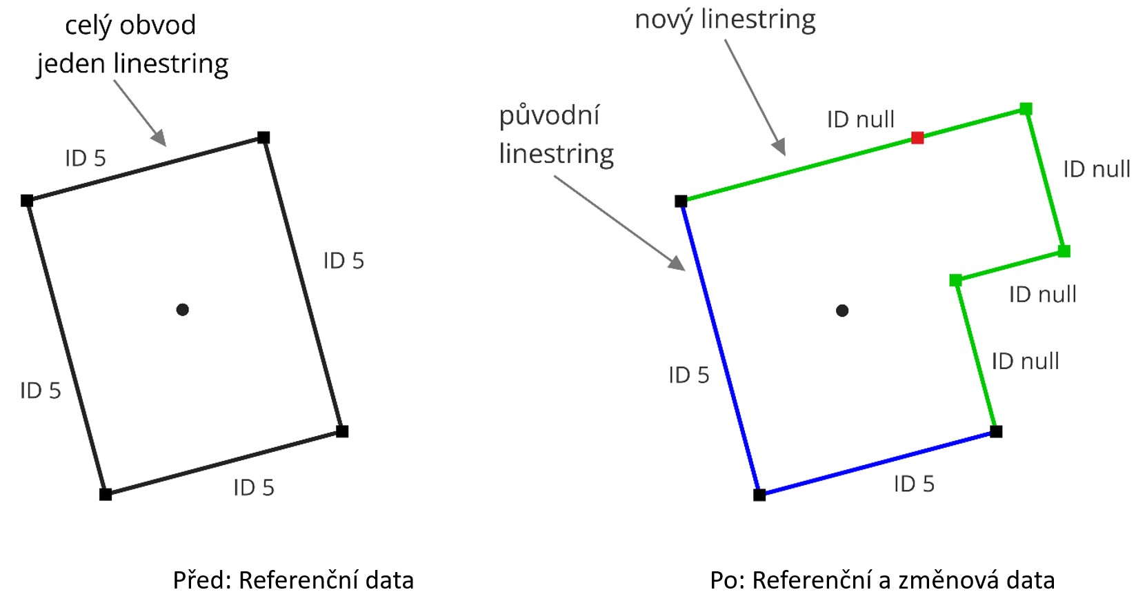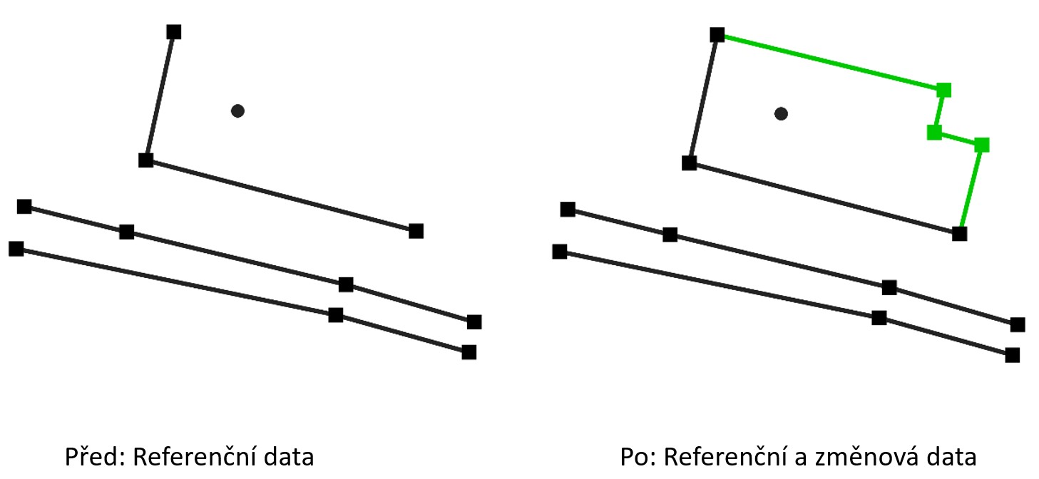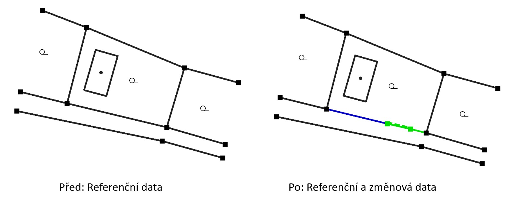 Změna geometrie stávající hranice budovy (update) a vložení třech nových podrobných bodů budovy (insert). Území s konsolidovanými daty.