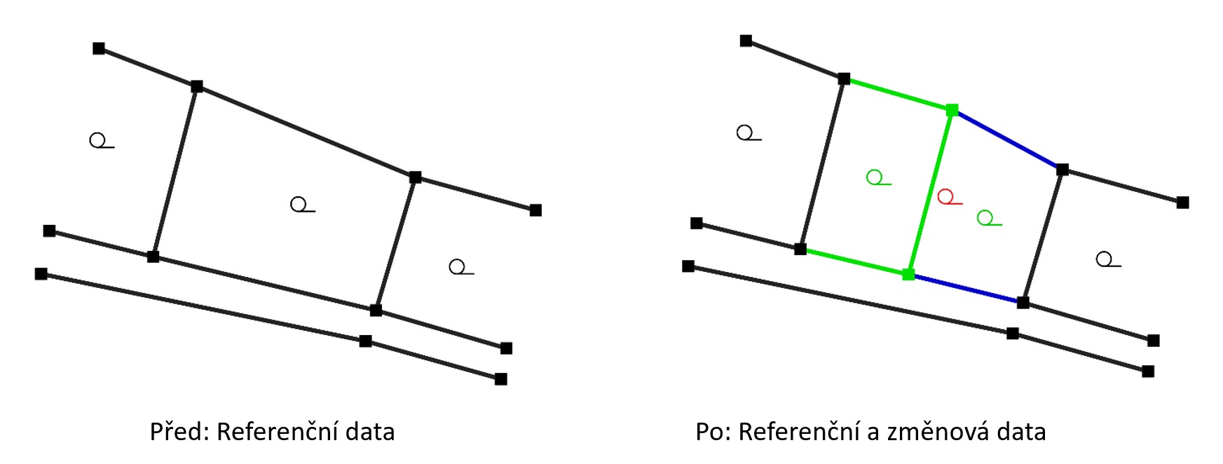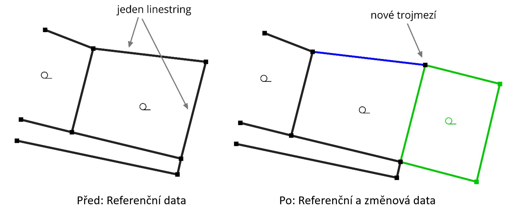 Nově vytvořené mapované objekty mohou vzniknout i dělením stávajících objektů, kdy jedna část prvku objektu bude mít hodnotu ZapisObjektuu“ s původním ID objektu a ostatní části budou mít ZapisObjektui“ s novým ID objektu. Toto bude častá operace při dělení linií na tzv. trojmezí, kde se linie kříží a je nutné je v místě křížení rozdělit. Tyto případy jsou více popsány níže v kapitole 2. Vznik nového objektu nikdy není možné dělat kopírováním stávajícího objektu, a to ani u nového definičního bodu.