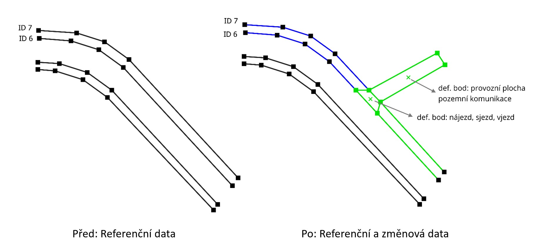 Změna geometrie stávajících konstrukčních liniích komunikace vyvolaná doplněním nových podrobných bodů pro potřeby napojení sjezdu, vytvoření plochy sjezdu a provozní plochy komunikace.