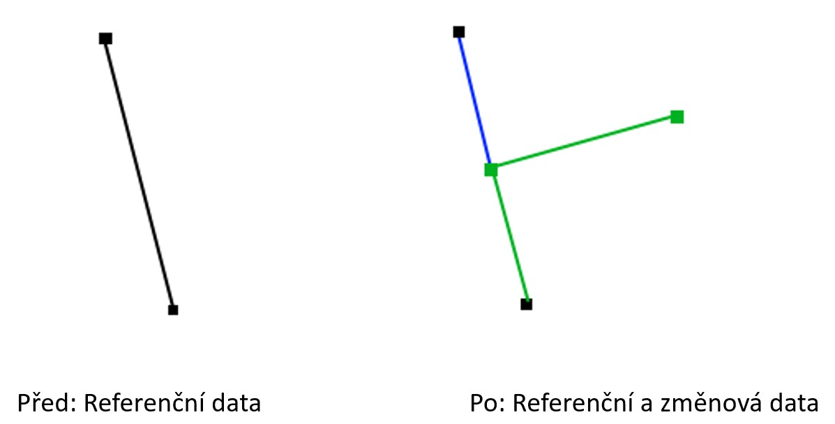 Nově vytvořené mapované objekty mohou vzniknout i dělením stávajících objektů, kdy jedna část prvku objektu bude mít hodnotu ZapisObjektuu“ s původním ID objektu a ostatní části budou mít ZapisObjektui“ s novým ID objektu. Toto bude častá operace při dělení linií na tzv. trojmezí, kde se linie kříží a je nutné je v místě křížení rozdělit. Tyto případy jsou více popsány níže v kapitole 2. Vznik nového objektu nikdy není možné dělat kopírováním stávajícího objektu, a to ani u nového definičního bodu.