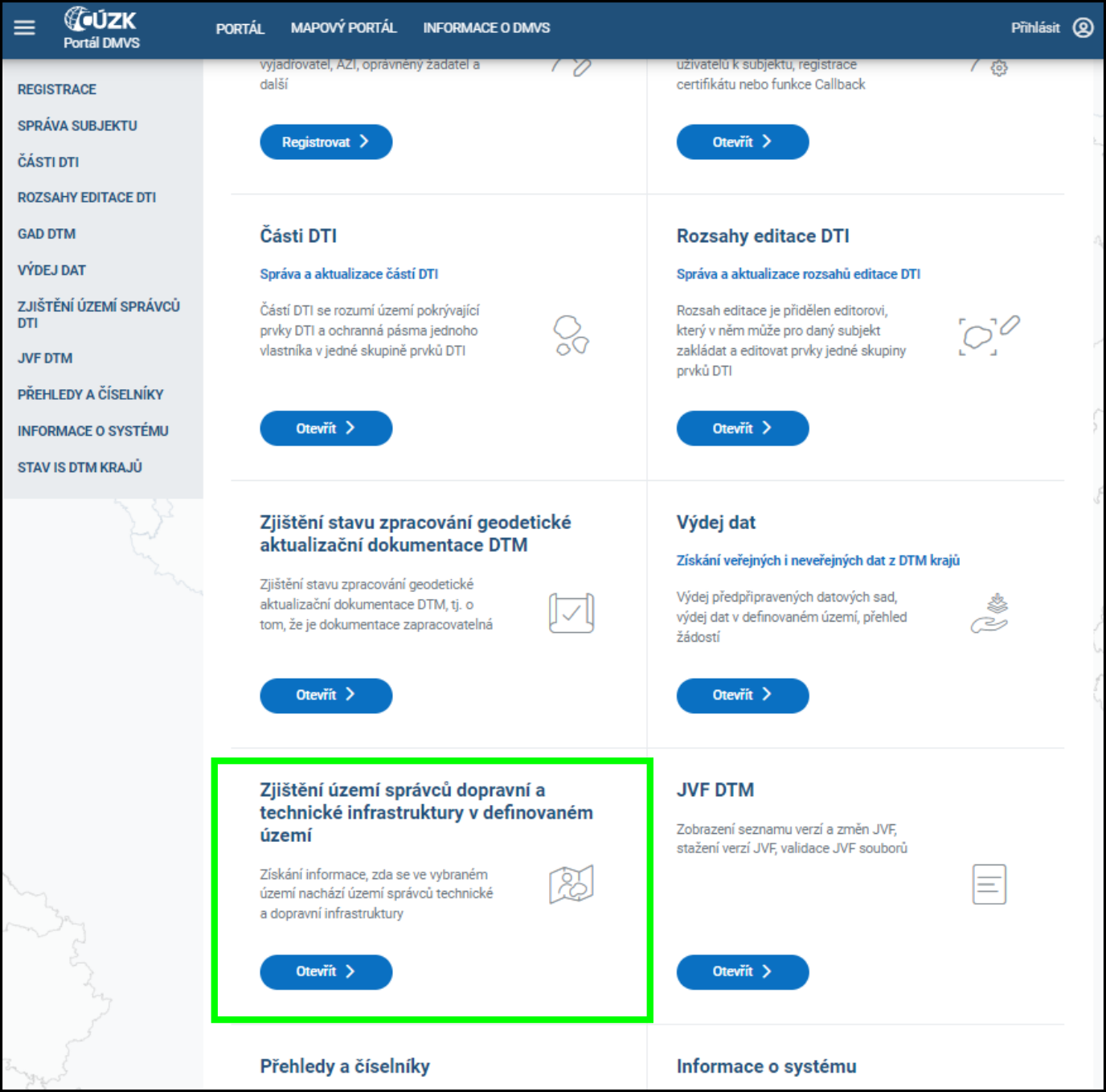 2. Otevřít dlaždici pod názvem „Zjištění území správců dopravní a technické infrastruktury v definovaném území“.