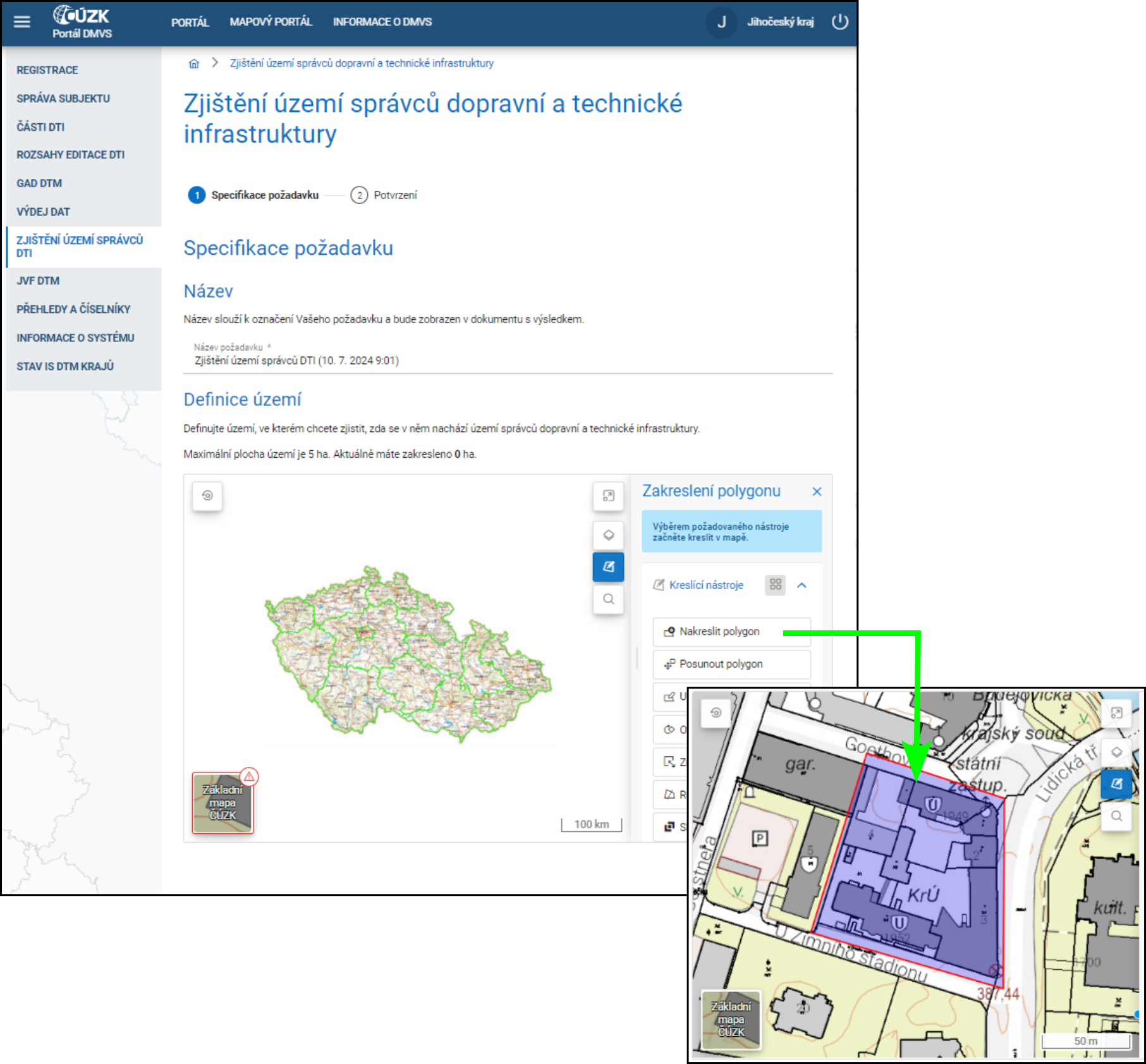 3. Specifikovat konkrétní požadavek dle posuzovaného záměru - název záměru a výběr území, za které je potřeba okruh vyjadřovatelů zjistit. Výběr území lze v tuto chvíli provést pouze zákresem polygonu v mapě, v následujících měsících by měla být doplněna funkčnost výběru území dle výčtu dotčených pozemků.
