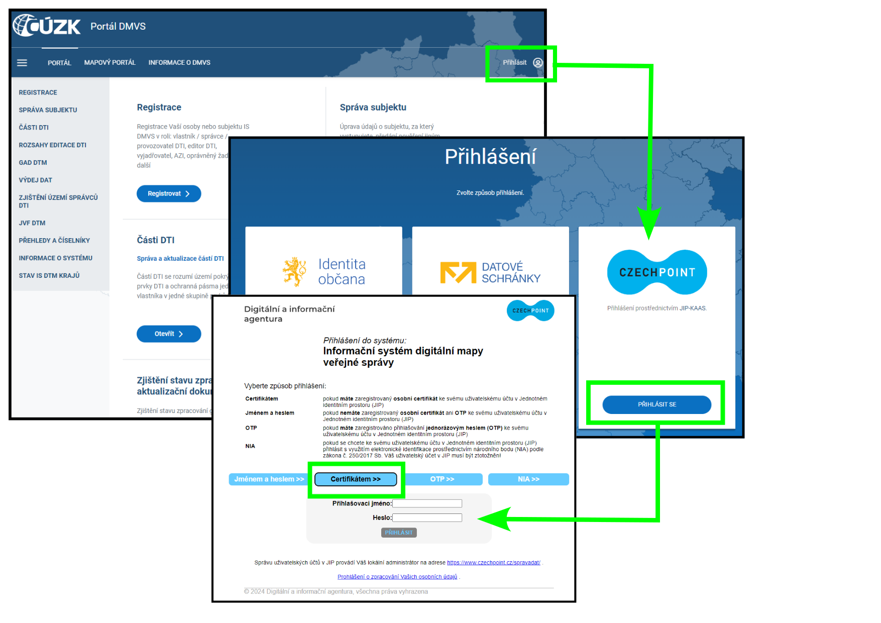 Pozn. Pro přístup do Portálu DMVS je nutné mít nastavené přístupové role v JIP/KAAS, návody pro lokální administrátory jsou dostupné na webových stránkách ČÚZK.