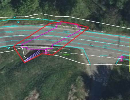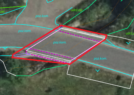 Obrázek 65: Obvod mostu (červeně) v náspu překlenuje řeku v rovině (svahy pod mostem jsou korytem řeky) Obrázek 65: Obvod mostu (červeně) v náspu překlenuje řeku v rovině (svahy pod mostem jsou korytem řeky)
