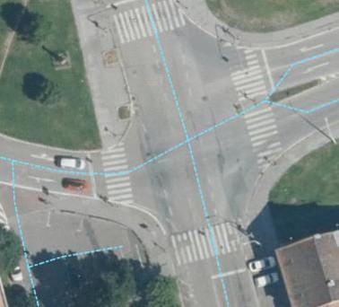 U asymetrických křižovatek se Osy PK vymezují dle dopravního značení, ze kterého je zřejmé, zda se jedná o jeden dopravní celek.