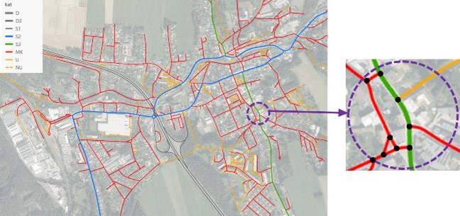 Linie úseků tvoří na sebe napojenou síť. Každá linie je napojena alespoň v jednom uzlu na ostatní linie. Izolované linie se mohou vyskytovat jen v rámci souboru komunikací jednoho správce, a to jen v případě, že tvoří s komunikacemi ostatních správců ucelený dopravní síťový graf – viz Obrázek 82.