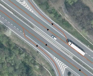 Obr. č. 5: Ukázka reálné situace odbočovacího pruhu na dálnici a její řešení
