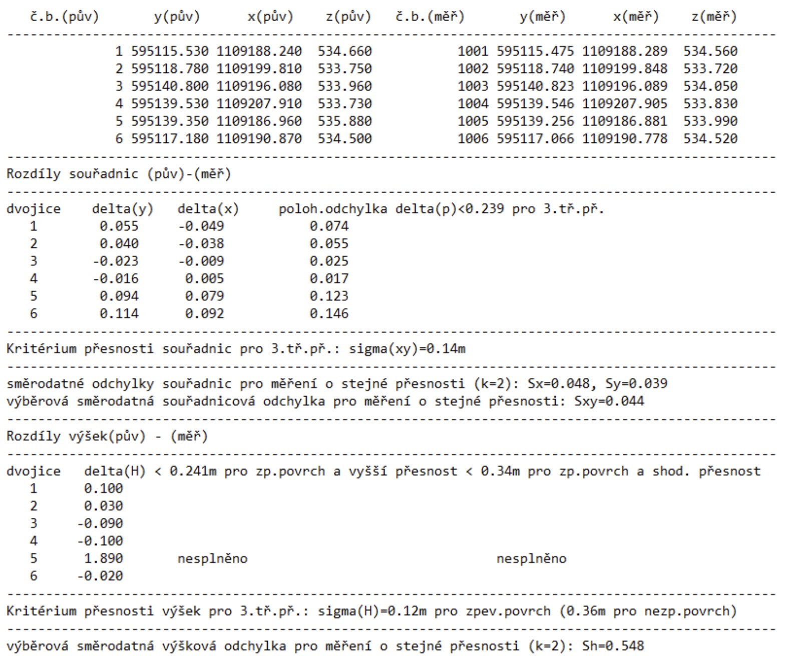 9) Testování přesnosti zpracovaných dat (včetně protokolu měření identických bodů):