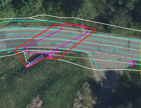 Obrázek č. 3: Obvod mostu v intravilánu. Zde je součástí mostovka s přesahem, aby byly zahrnuty i římsy (mostní vybavení) mimo mostovku. Most je nad železnicí, je umístěn v zářezu, tedy svahové kužely nejsou zahrnuty do obvodu mostu.
