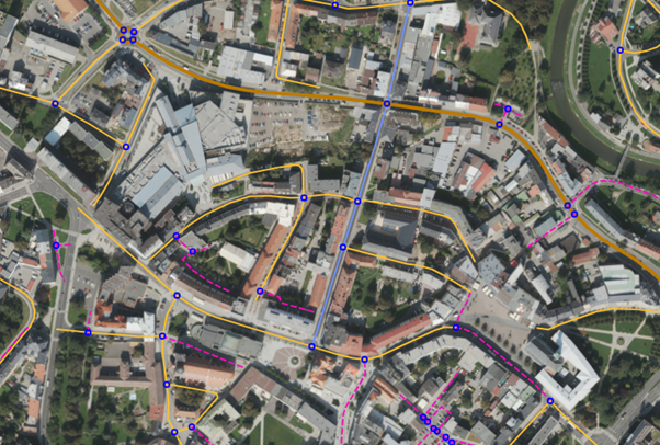Poznámka: Vazba na ULS je řešena v dotazu Osa pozemní komunikace v křižovatkách. Napojení DI obcí na DI kraje by mělo reflektovat skutečnost a data by na sebe měla navazovat, tak aby situace na obrázku č. 5 neevokovala případ, kdy na sebe ulice opravdu nenavazují a jsou např. fyzicky odděleny chodníkem (viz. Obr. 6). Úseky DI kraje je vhodné v místě napojení DI obce dělit na samostatné úseky a přidělovat jim odpovídající atributy tzn, že v místě napojení je potřeba vložit lomový bod linie, aby se zachovala požadovaná topologie.