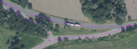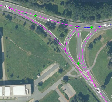 Úprava os pozemních komunikací dle skutečnosti – další případy řešení os pozemních komunikací jsou uvedeny na Obr. č. 4 až č. 6. Zde je uveden návrh řešení uzlových bodů a os pozemních komunikací dle skutečnosti pro potřeby DTM (fialové body – uzlové body silniční sítě dle skutečnosti, zelené body – původní body v ULS).