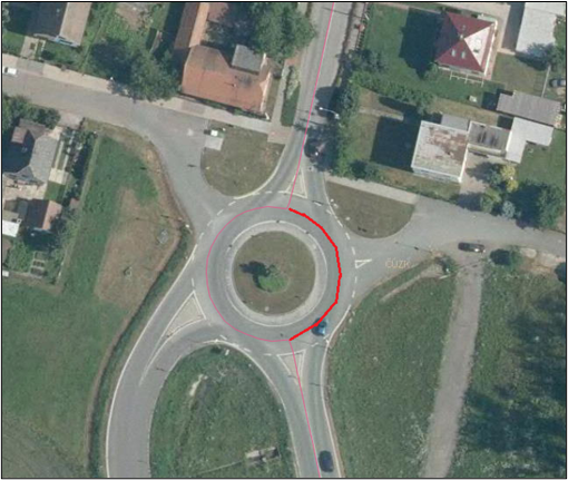 Dalším příkladem je okružní křižovatka, Obr. č. 10. Dle SDB je řešena tenkou červenou linií. V projektech DTM kraje bude vykreslen celý průběh (tlustá červená), který bude doplněn dle skutečnosti.
